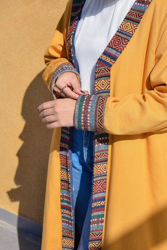 Linen Yellow Dress with Linen and Fur Long Jacket and Sodo Belt