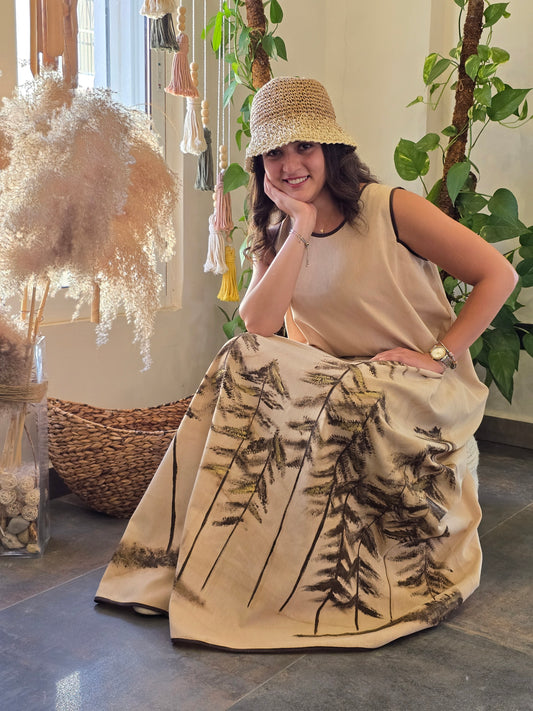 Linen Beig Long dress painted with Coffee