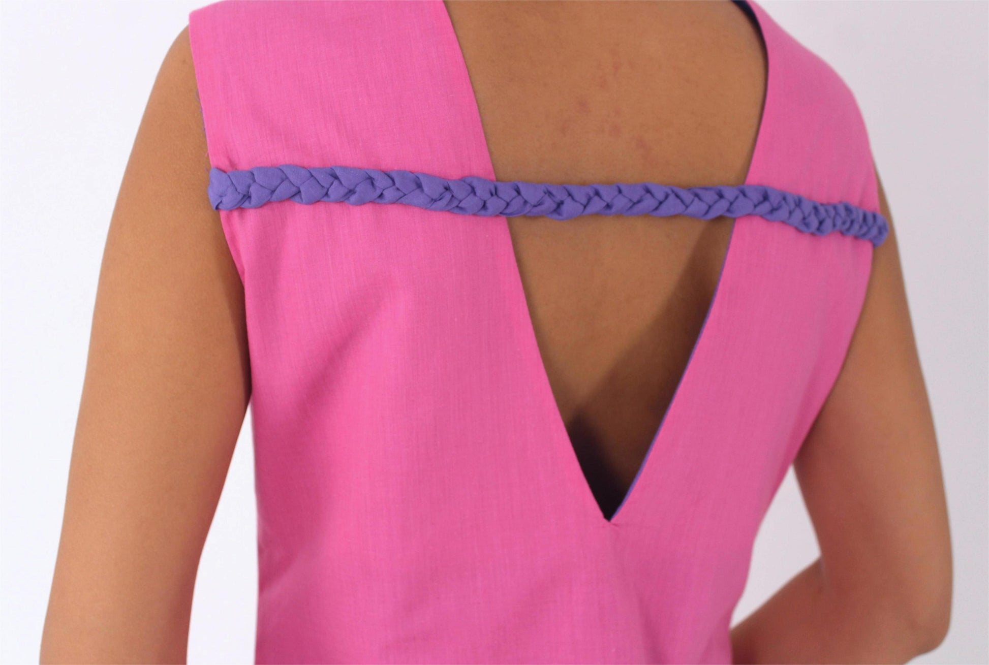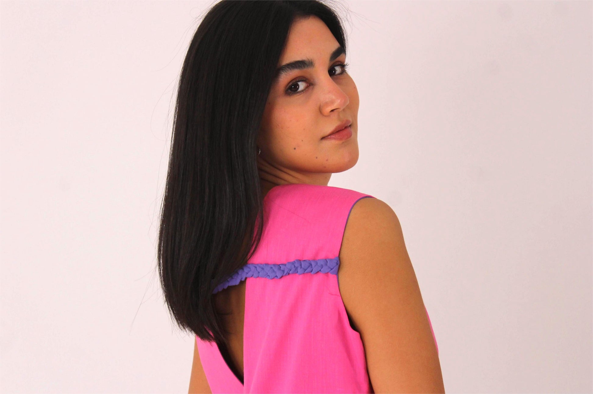 Made from breathable cotton-linen, it features a clean A-line silhouette with hand-braided accents in vibrant purple and yellow—wrapping the neckline, hem, and back with playful elegance. The entire piece is fully lined in purple, offering comfort, confidence, and a discreet touch of contrast.