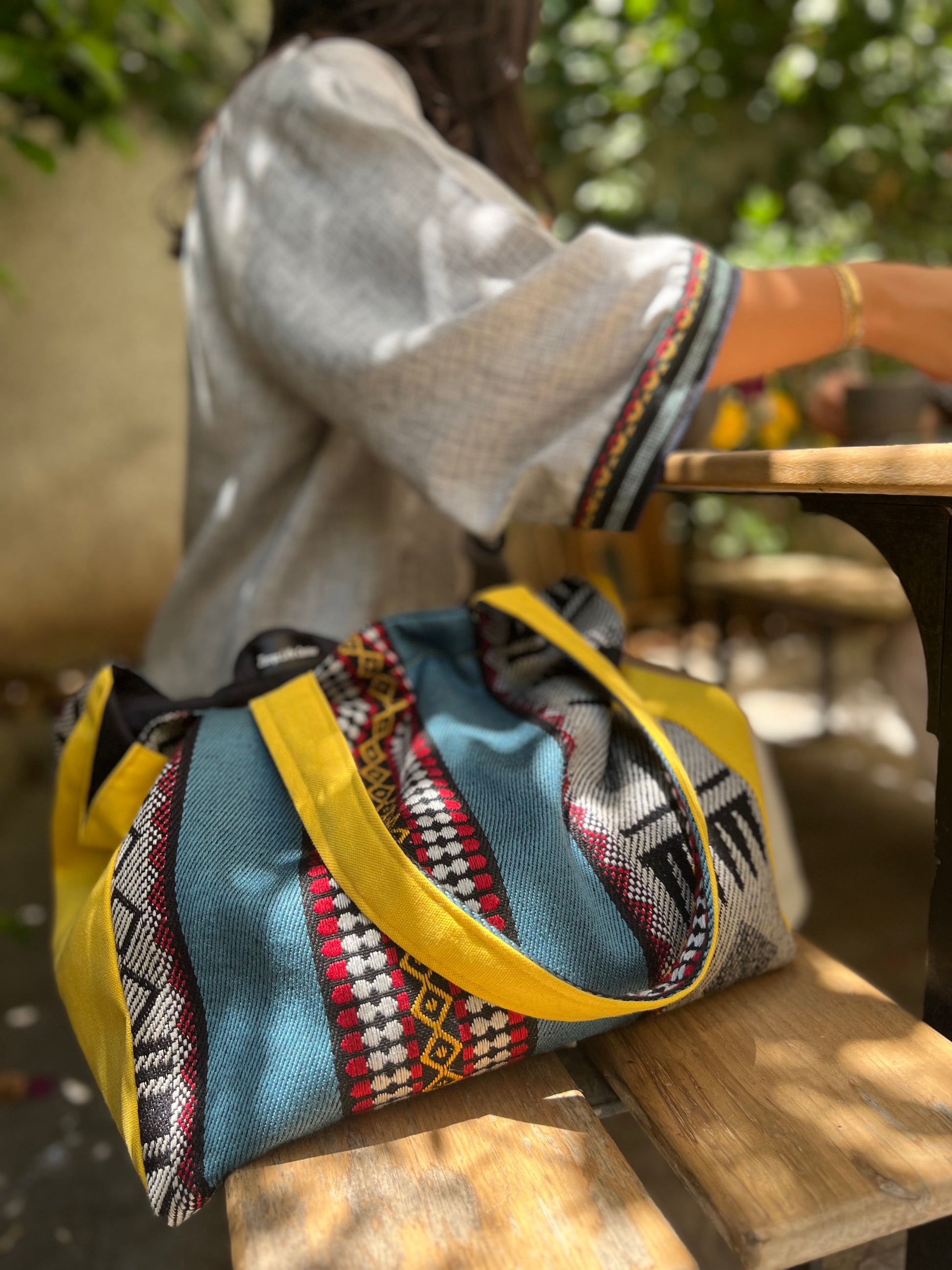 Introducing our bold yellow and blue handmade tote bag, a vibrant accessory that makes a striking statement in both fashion and purpose. Crafted by the talented women of the Zarqa Life Center, each tote bag is not only a testament to exquisite craftsmanship but also a beacon of empowerment and support for the artisans who infuse their passion into every stitch. Carry it with pride, knowing you're supporting a community of resilient women and their enduring craft.