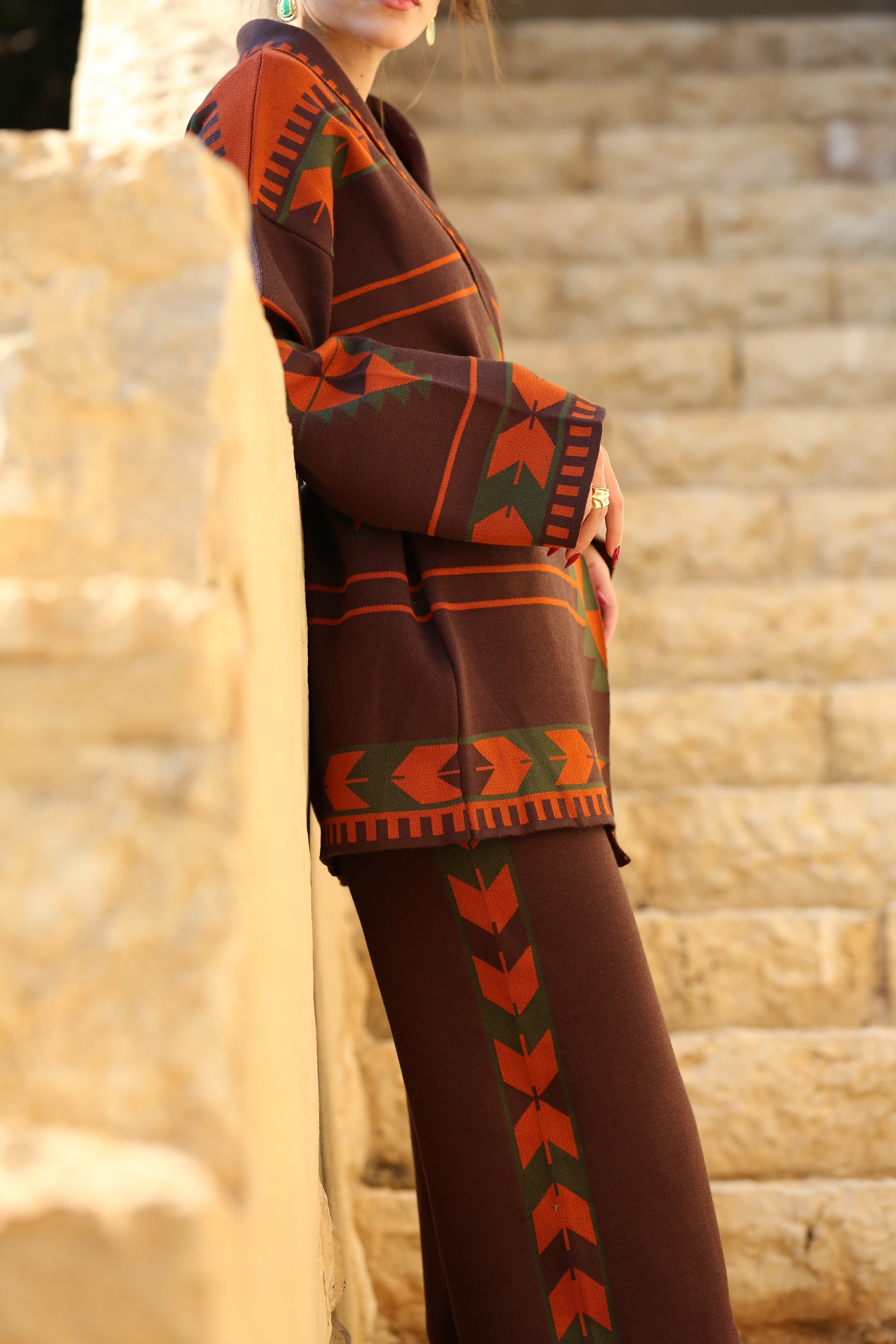 Crafted from a blend of viscose and cotton threads, the set offers a soft yet structured feel, balancing comfort with presence. The knit construction allows for ease of movement, while the bold geometric pattern adds depth and character without overpowering the design.